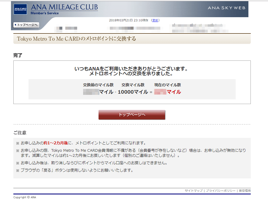 - ANAマイル→メトロポイントへの移行は1~2か月かかる