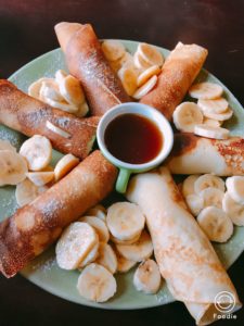 - バナナパンケーキ ミディアム 65K 巻いたパンケーキが5、6枚入っていてボリュームあり。おいしい。