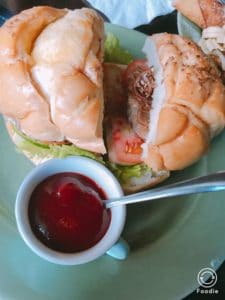 - ハガーバーガー 65K うまい!パンが「マックとは違うのだよ、マックとは」。シェアするために半分にカットしてくれた。
