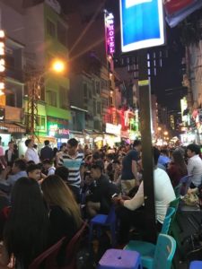 レストランからブイビエンに戻ると圧巻!爆音で洋楽が流れ、歩行者天国の道にはプラスチックのミニ椅子が並べられ人で埋め尽くされている。
